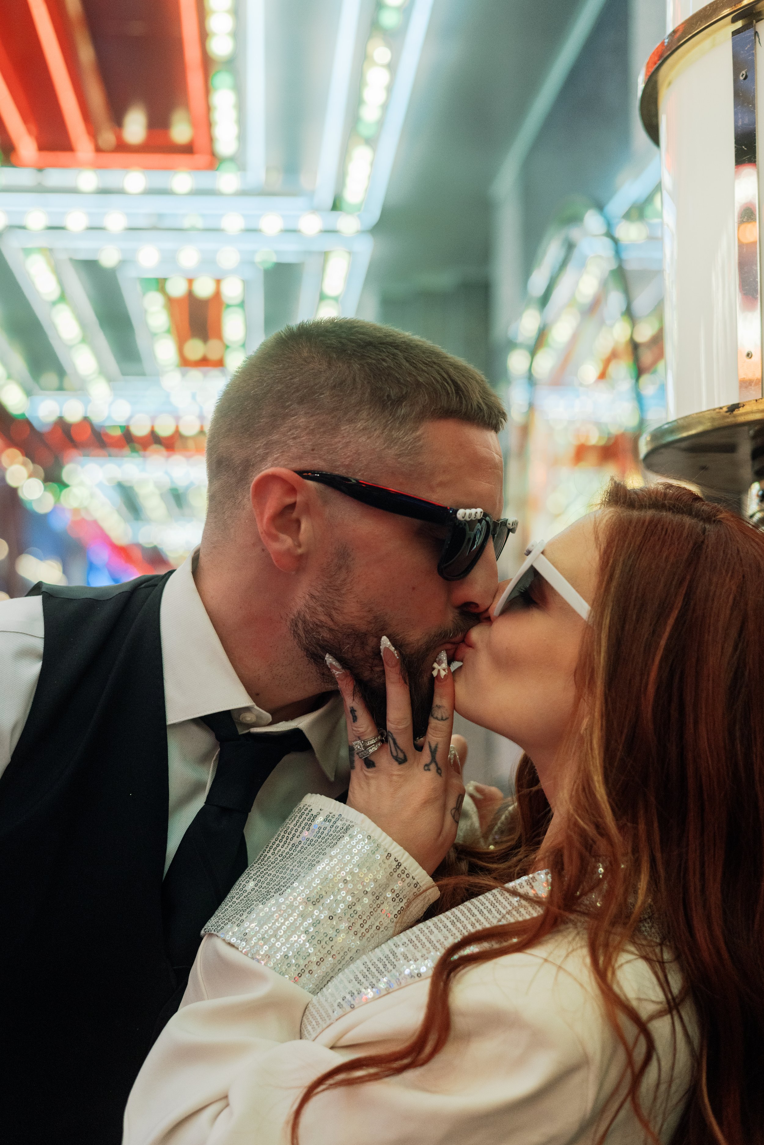 A man and woman in sunglasses posing together in a neon-lit casino or arcade, with the woman wearing heart-shaped sunglasses and the man wearing dark sunglasses.