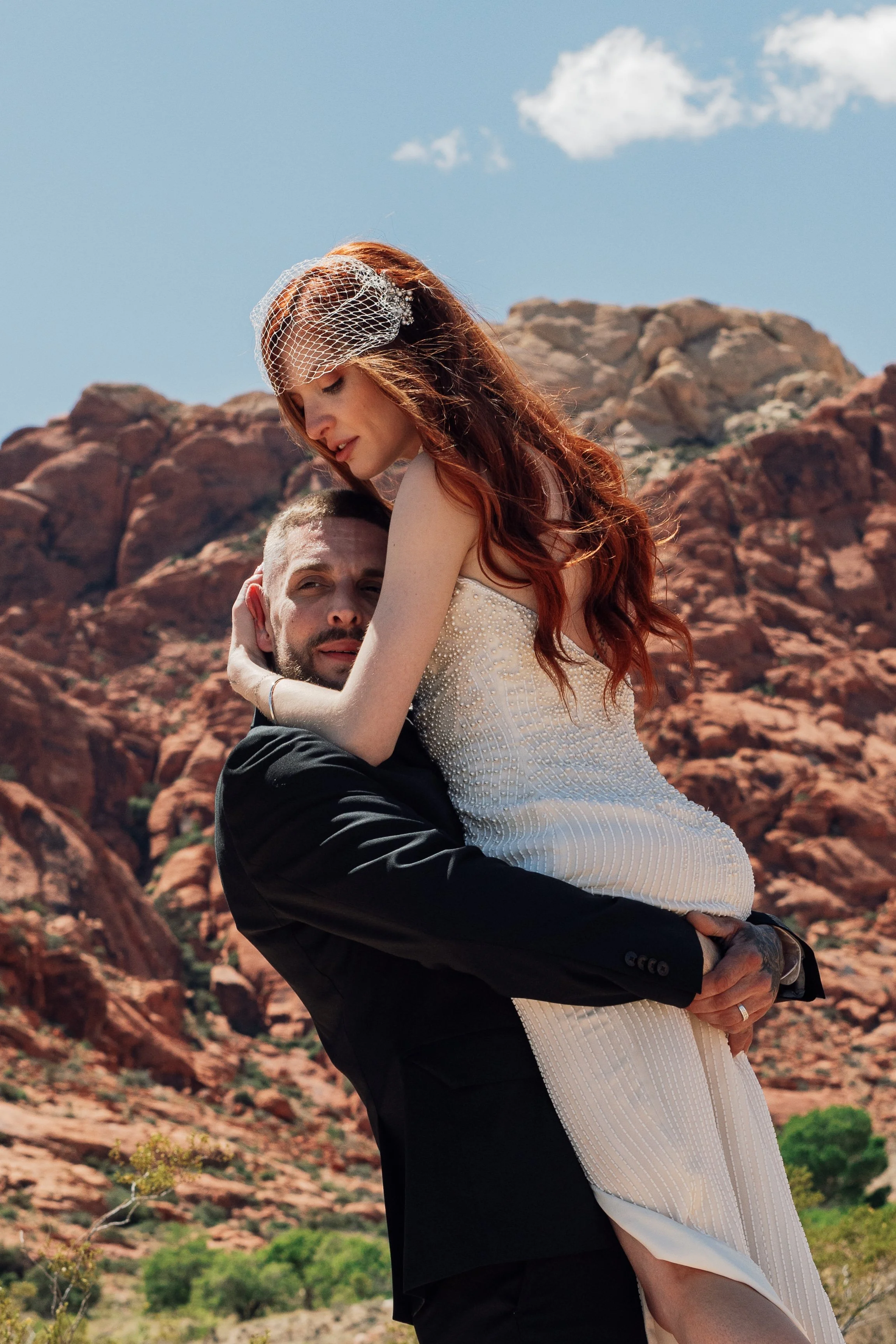 A man in a black suit holding a woman in a white wedding dress, with red hair and a birdcage veil, against a backdrop of red rocks and blue sky.