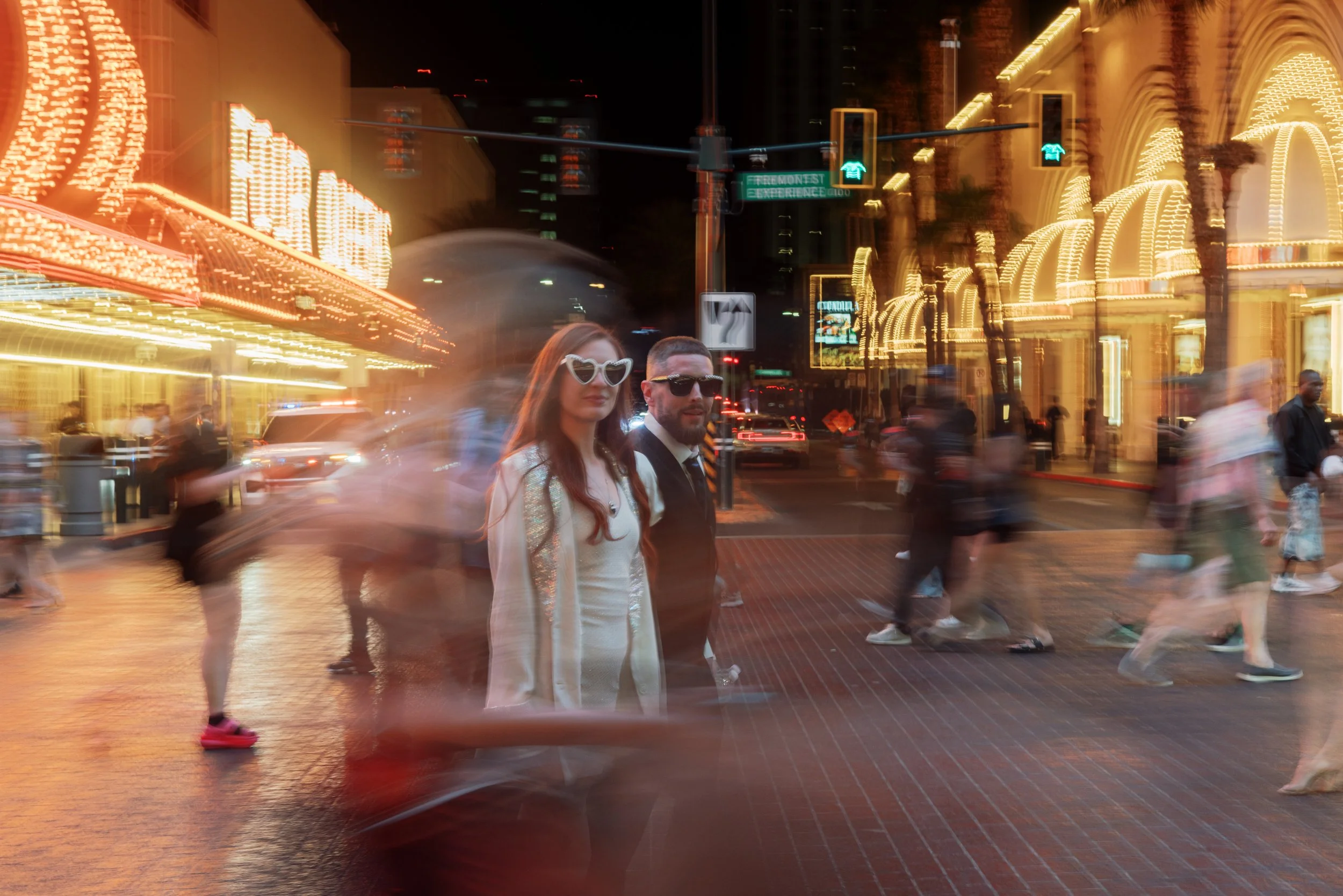 Nighttime city street scene with blurred pedestrians and illuminated building facades; two people in the foreground, a woman with long hair and heart-shaped sunglasses, and a man with sunglasses, standing still amidst moving crowd.