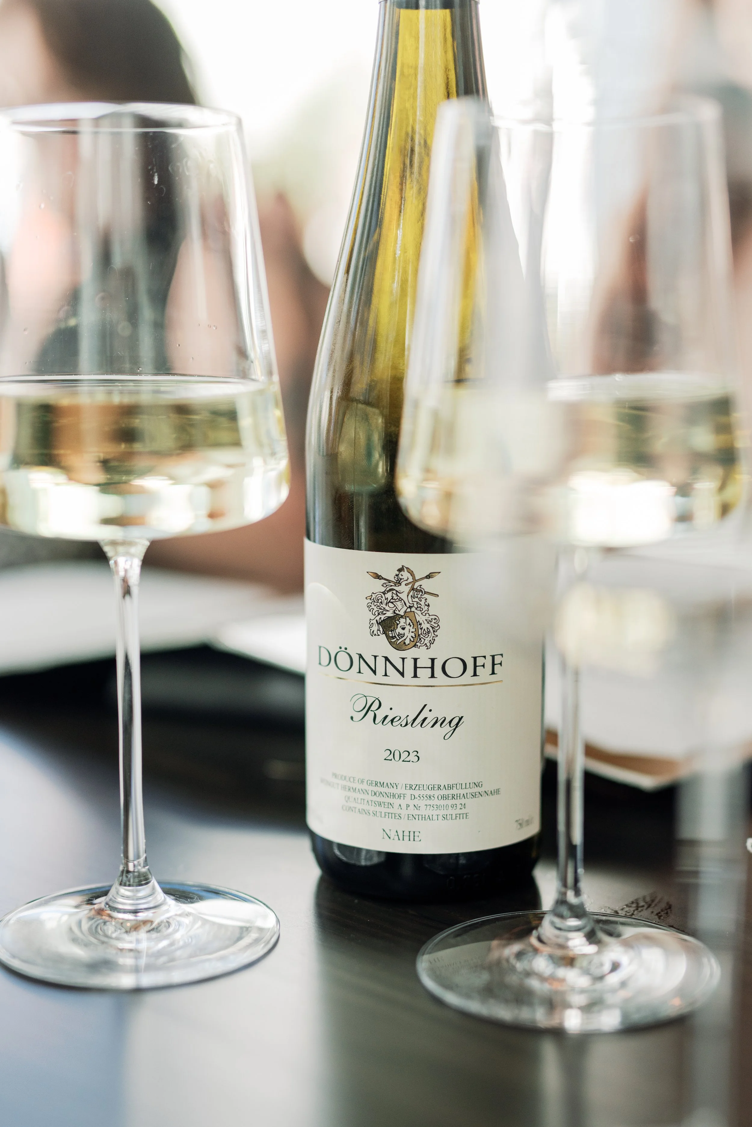 A bottle of Dönhoff Riesling 2023 wine with two filled wine glasses on a dark table, with a blurred background.